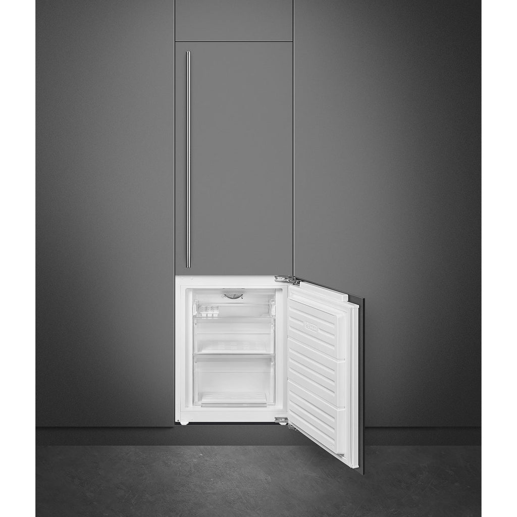 The Smeg Fully Integrated Fridge/ Freezer SABI256BM is a built-in, bottom-mount unit combining elegant design with modern technology. It features an internal LED display for precise temperature control and bright LED lighting for easy shelf visibility and better food organization.